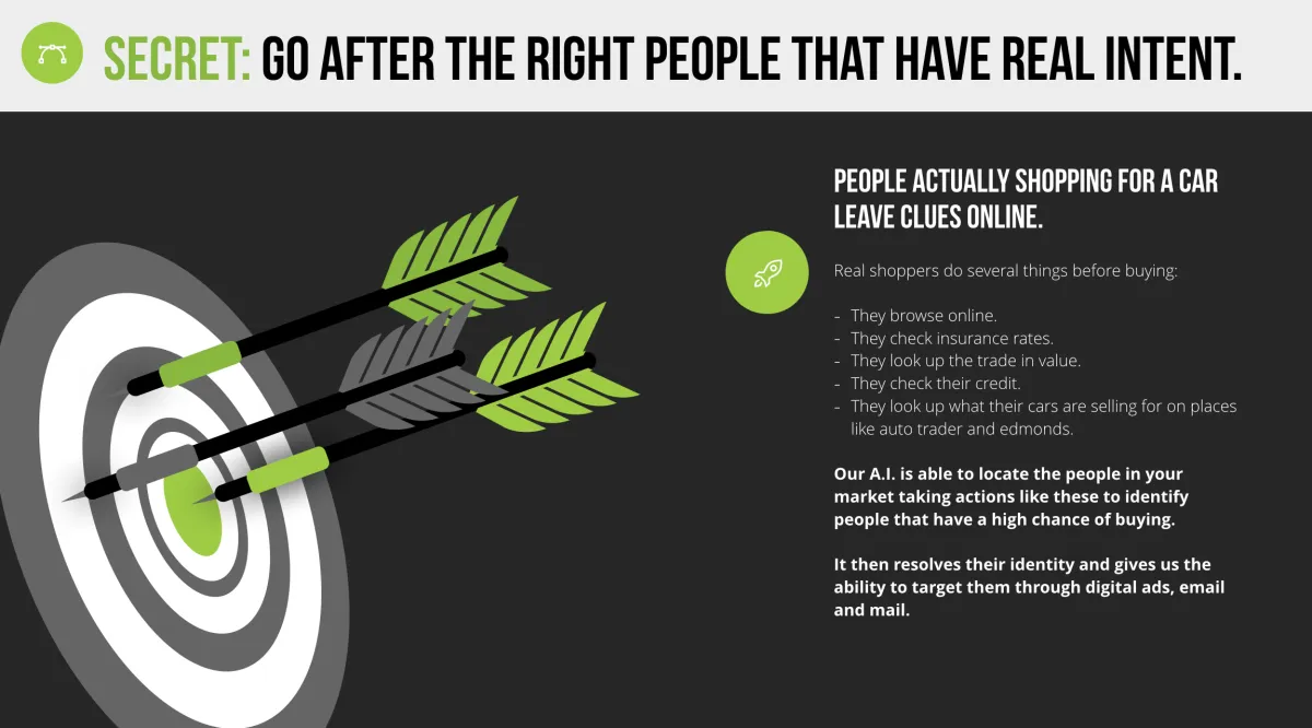 Tired of digital solutions that the agency tells you is working... "Look at all of your clicks and page views!" They say. But they can't attribute it to any sales whatsoever? Our upstream program helps you go after REAL shoppers with intent. It's also 100% trackable. It will bring a horde of buyers to shop with you. We have a 95% repeat rate with this program among dealers, if that tells you how effective it is.