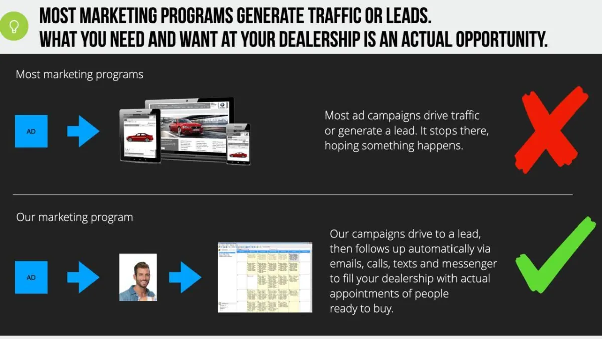 Most marketing programs offer traffic or leads. The problem is they are incomplete. You don't need more leads, you need people in your showroom to desk a deal with. With our Appointments On Demand program we get you closer to sale by generated high quality appointments with people about to buy and trade cars in the next month. With close rates as high as they are for these types of appointments, this program can dramatically help you sell more cars.